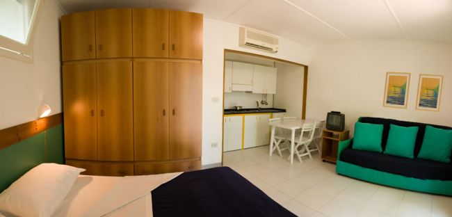 di diverse tipologie, monolocale, al piano terra, aria condizionata, frigo, tv, cassetta di sicurezza, 1 letto matrimoniale, bagno con doccia e bidet. 3° e 4° posto letto a castello o divano letto. Veranda attrezzata con tavolo e sedie.