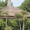 Costruzione con tetto di paglia, patio e vegetazione attorno.