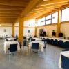 Ristorante luminoso con tavoli apparecchiati e sedie blu.