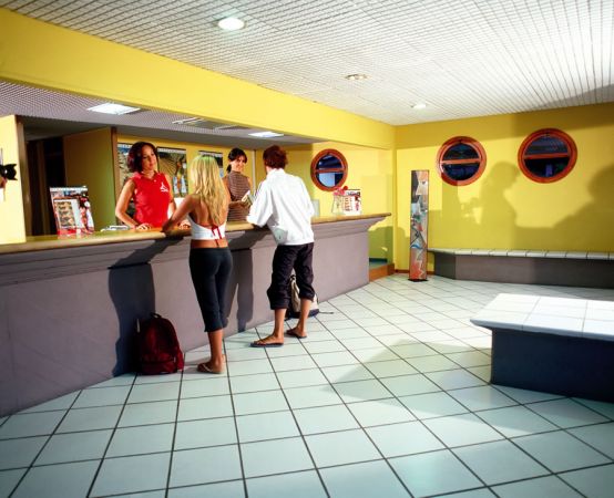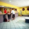 Persone alla reception dietro un bancone in una stanza con pareti gialle e piastrelle bianche.