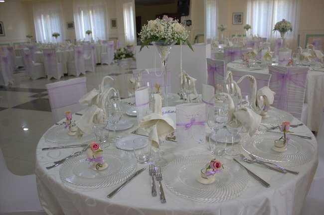 Tavolo elegantemente apparecchiato per un ricevimento.