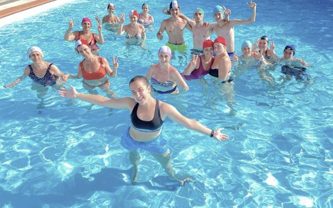 Persone in piscina con cuffie colorate, sorridono e salutano.